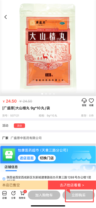 4、在藥品詳情頁,點擊立即購買按鈕,進行該藥品的購買操作。