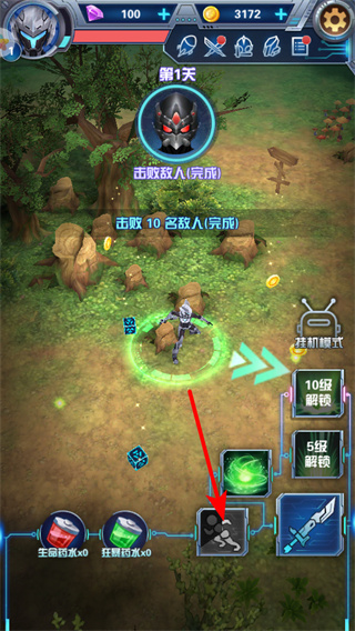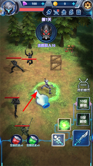 1、游戲中點擊角色移動區(qū)域,可操控角色移動并攻擊敵人,這是戰(zhàn)斗的關(guān)鍵操作,移動時需關(guān)注敵人的分布攻擊范圍。
