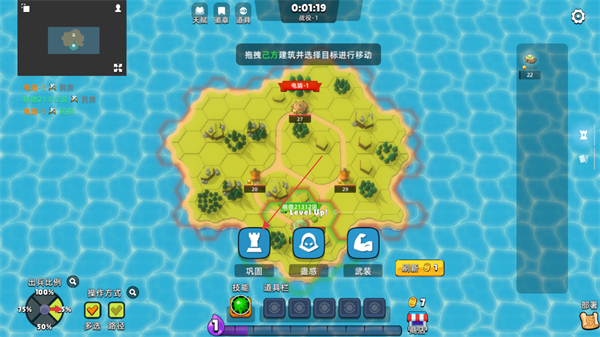 1、在島嶼地圖上,拖拽史萊姆并選擇目標(biāo)進(jìn)行移動,搶占領(lǐng)地和資源點(diǎn)。