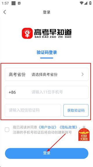 3、在登錄頁(yè)面選擇高考省份、輸入手機(jī)號(hào)、獲取并填寫驗(yàn)證碼,勾選協(xié)議后點(diǎn)擊登錄,完成賬號(hào)登錄操作。