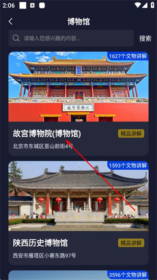 2、在博物館列表中,點(diǎn)擊感興趣的條目,進(jìn)入該博物館的詳情頁(yè)面。