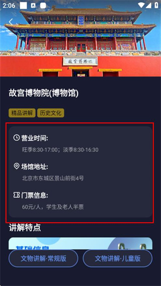3、在故宮博物院詳情頁(yè),即可查看其營(yíng)業(yè)時(shí)間、場(chǎng)館地址、門(mén)票信息等基礎(chǔ)內(nèi)容。