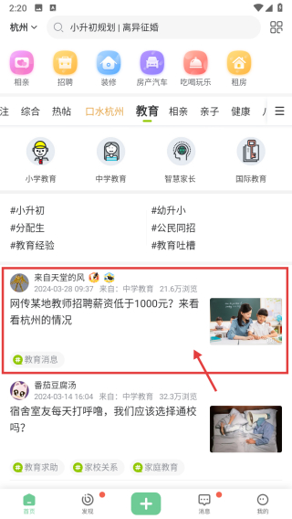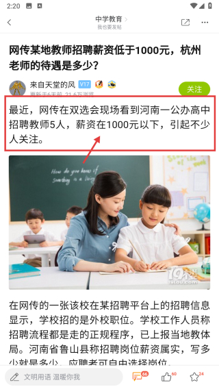 3、在教育分類頁面,選擇網(wǎng)傳某地教師招聘薪資低于1000元的帖子條目,進入帖子詳情頁。