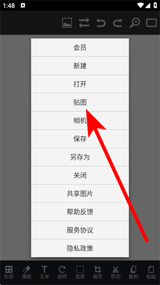 1、打開圖片編輯工具,點(diǎn)擊頂部功能菜單,選擇貼圖。