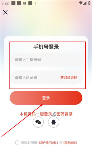 3、在手機(jī)號(hào)登錄頁面,輸入手機(jī)號(hào)碼、獲取并填寫驗(yàn)證碼,勾選協(xié)議后,點(diǎn)擊登錄完成賬號(hào)登錄操作。
