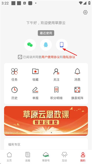2、在個(gè)人頁面中,點(diǎn)擊最近使用區(qū)域的手機(jī)號(hào)圖標(biāo),進(jìn)入登錄界面。