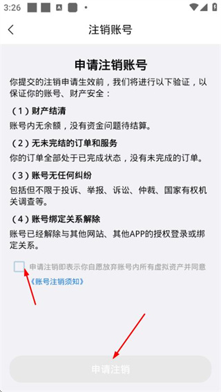 5、在注銷賬號頁面,勾選須知,即可點擊申請注銷推進賬號注銷操作。