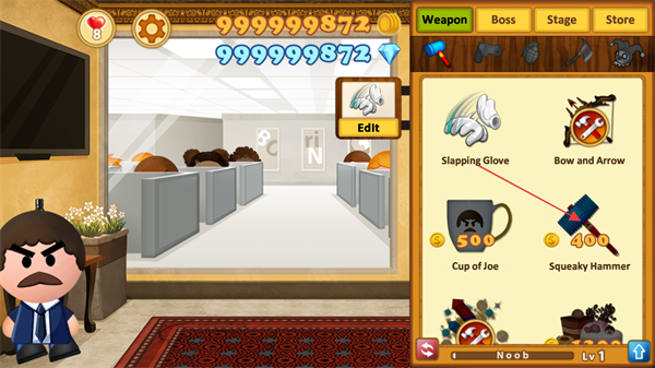 2、點(diǎn)擊右上角的箭頭按鈕,可以打開商城購(gòu)買道具來打大老板。