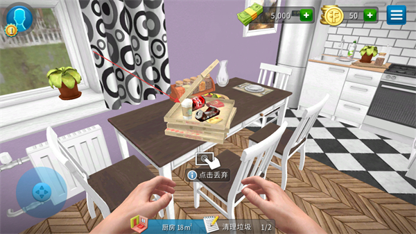 4、繼續(xù)在廚房?jī)?nèi)找到桌上的垃圾,點(diǎn)擊丟棄按鈕,完成任務(wù)。