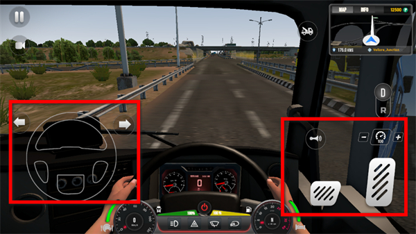 2、通過左側(cè)的方向控制按鈕操控卡車的轉(zhuǎn)向,右側(cè)的加速和剎車按鈕控制卡車的速度。