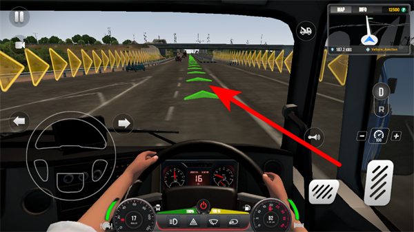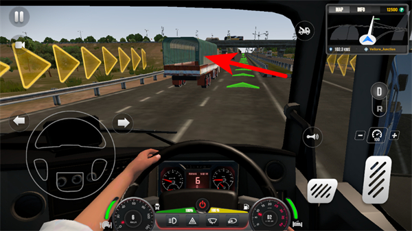 4、駕駛卡車完成運(yùn)輸任務(wù),在行駛過程中可根據(jù)路況調(diào)整車速和方向,順利抵達(dá)目的地。