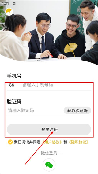 4、在手機號登錄頁面,輸入手機號碼驗證碼后,點擊登錄注冊,完成登錄操作。