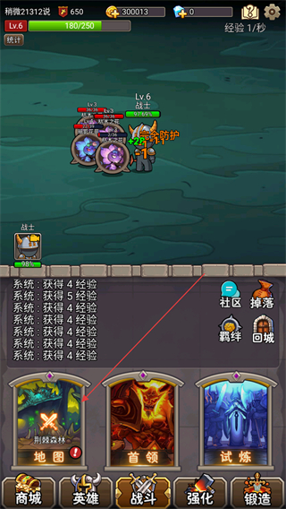 1、操控戰(zhàn)士在黑鋒叢林地圖中自動戰(zhàn)斗,攻擊怪物獲取經(jīng)驗和金幣,向旗幟目標(biāo)推進。
