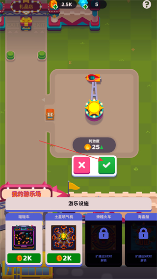 2、在下方選擇一個(gè)游樂(lè)設(shè)施,可以查看設(shè)施的刺激度進(jìn)行挑選,點(diǎn)擊綠色對(duì)勾按鍵確定安裝。