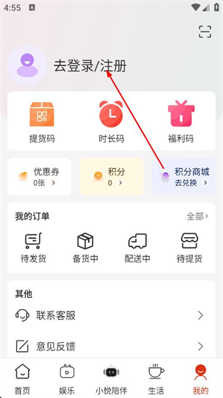 3、在個(gè)人頁(yè)面,點(diǎn)擊去登錄/注冊(cè),進(jìn)入登錄選擇頁(yè)面。