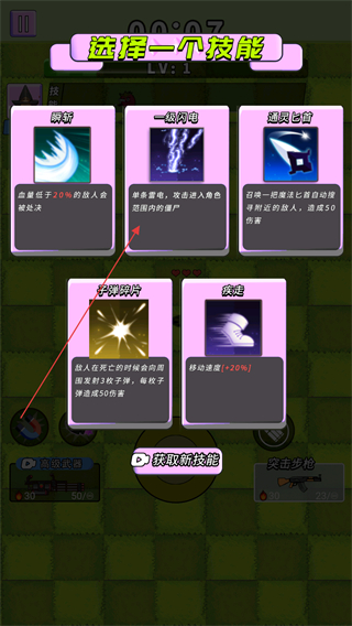 4、升級后選擇技能如一觸即電,增強(qiáng)戰(zhàn)力,持續(xù)突圍打怪。