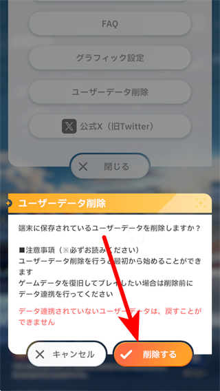 3、在用戶數(shù)據(jù)刪除頁面,仔細閱讀注意事項后,點擊削除する刪除按鈕,即可完成賬號注銷操作。