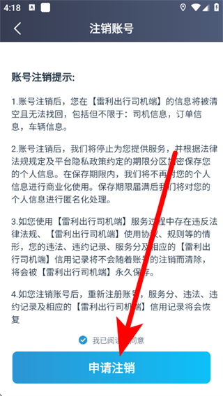 5、在注銷賬號頁面,勾選我已閱讀同意后,點擊申請注銷。