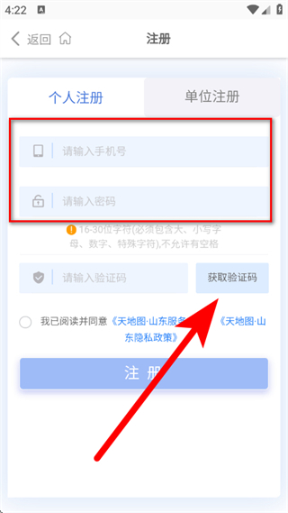 4、在注冊(cè)頁面,輸入手機(jī)號(hào)、密碼后,點(diǎn)擊獲取驗(yàn)證碼。