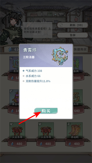 2、坊市中遇到合適的法器如青霄環(huán),點擊購買可增強(qiáng)角色戰(zhàn)力,購買時需結(jié)合自身職業(yè)和屬性需求選擇法器。