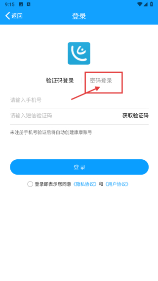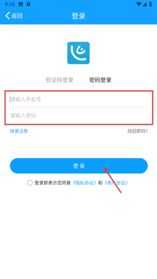 4、在密碼登錄頁面,輸入手機(jī)號(hào)和密碼,點(diǎn)擊登錄按鈕,完成賬號(hào)登錄操作。
