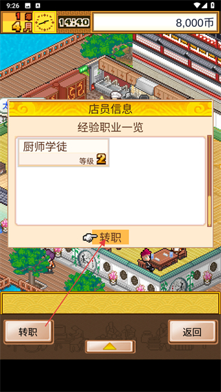 4、在店員經(jīng)驗(yàn)職業(yè)一覽表中,可以點(diǎn)擊轉(zhuǎn)職按鈕申請(qǐng)調(diào)換職務(wù)位置。