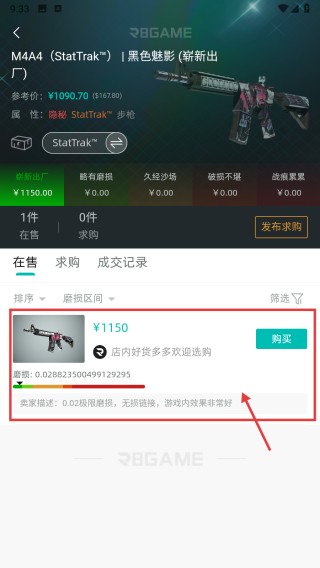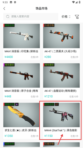 2、在飾品市場列表里,選擇M4A4-StatTrak?|黑色魅影嶄新出廠飾品條目,進(jìn)入飾品詳情頁。