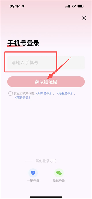 3、在手機號登錄頁面,輸入手機號后點擊獲取驗證碼。