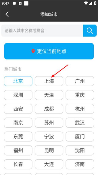 3、在添加城市頁面的熱門城市區(qū)域,點(diǎn)擊上海,即可完成該城市的添加操作。