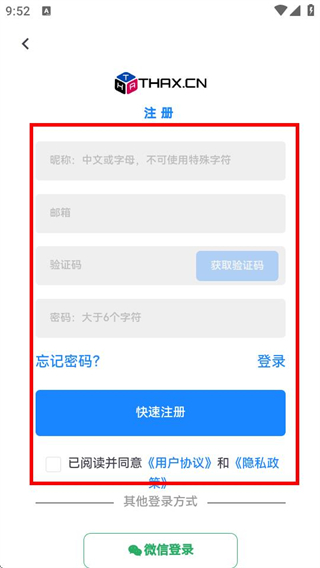 4、在注冊頁面,填寫信息,勾選協(xié)議后點擊快速注冊,完成賬號注冊。