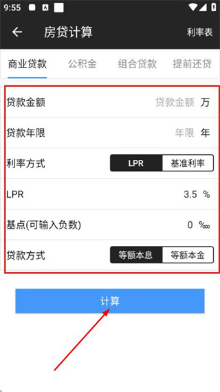 3、在房貸計(jì)算頁(yè)面填寫(xiě)相關(guān)信息后,點(diǎn)擊計(jì)算,即可獲取房貸計(jì)算結(jié)果。