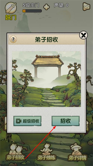 1、點(diǎn)擊“弟子招收”,選擇招收或超級招收獲取弟子,為宗門收集更多弟子。