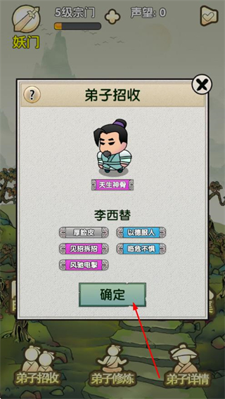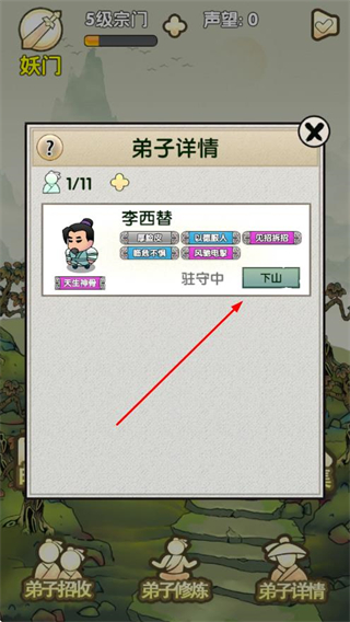 4、在弟子詳情界面查看弟子狀態(tài),點(diǎn)擊下山派遣弟子外出歷練,提升宗門等級。