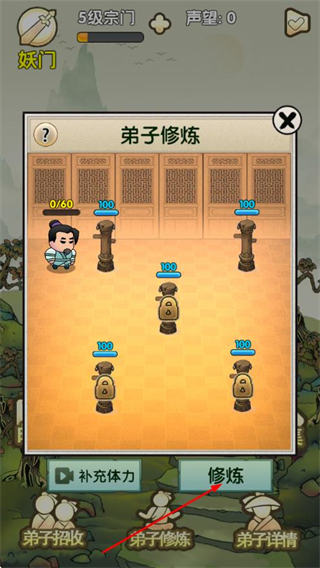 3、進(jìn)入弟子修煉界面,安排弟子在修煉木樁處修煉,提升弟子實力。