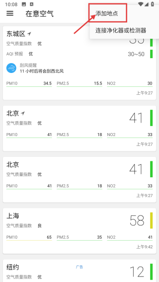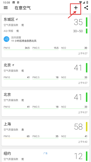 1、打開空氣質(zhì)量類APP,點擊右上角加號圖標,彈出功能菜單。