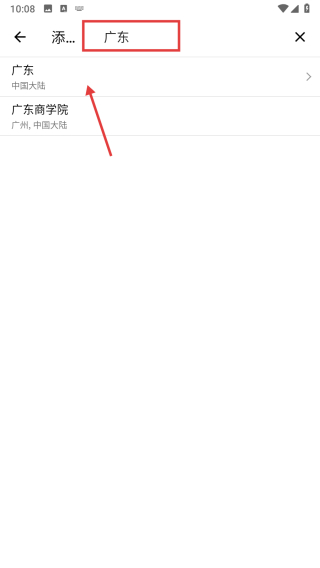 3、在地點搜索頁面,輸入廣東,選擇廣東地區(qū)。