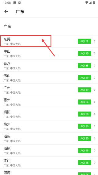 4、在廣東地區(qū)列表里,選擇東莞選項,添加?xùn)|莞地區(qū)的空氣質(zhì)量監(jiān)測點。