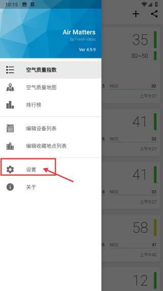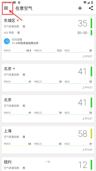 1、打開空氣質(zhì)量類APP,點擊左上角菜單圖標,彈出功能菜單。