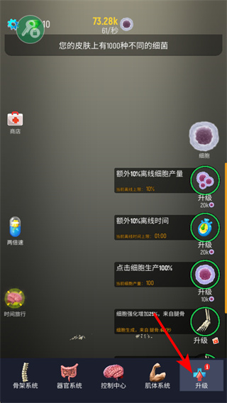 1、游戲中點(diǎn)擊升級(jí)按鈕,可提升細(xì)胞、器官等系統(tǒng)的屬性,這是增強(qiáng)發(fā)育效率的關(guān)鍵操作,關(guān)注消耗增益。
