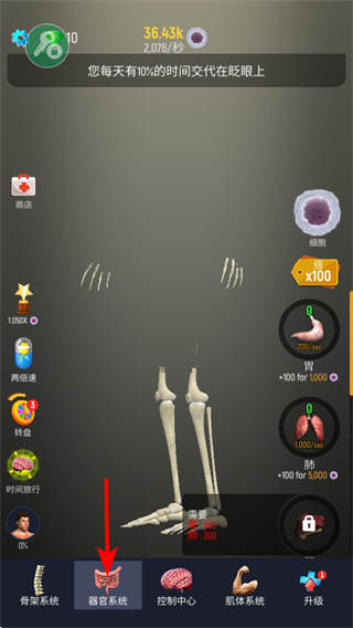 3、點(diǎn)擊器官系統(tǒng),可解鎖和升級(jí)人體器官如肺、胃,是完善人體結(jié)構(gòu)的核心步驟,資源情況解鎖關(guān)鍵器官。