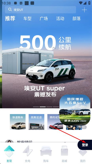 1、在發(fā)現(xiàn)頁面點擊底部登錄按鈕,進(jìn)入埃安的登錄頁面。