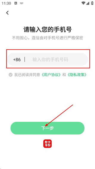3、在手機號輸入頁面,輸入手機號碼,勾選同意后點擊下一步。