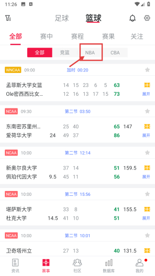 2、在籃球賽事頁(yè)面,點(diǎn)擊NBA分類選項(xiàng),進(jìn)入NBA賽事頁(yè)面。