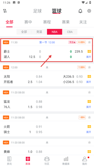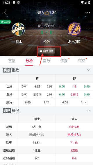 3、在NBA賽事頁(yè)面里,選擇爵士對(duì)陣湖人的賽事條目,進(jìn)入賽事詳情頁(yè)。