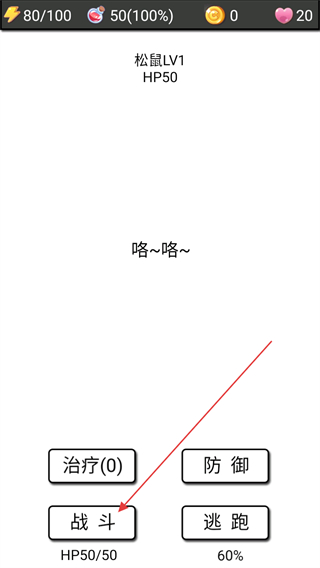2、進(jìn)入劇情部分,遭遇到了松鼠攻擊,可以選擇攻擊或逃跑,逃跑會(huì)有幾率失敗,所以可以選擇戰(zhàn)斗進(jìn)行攻擊。