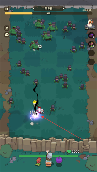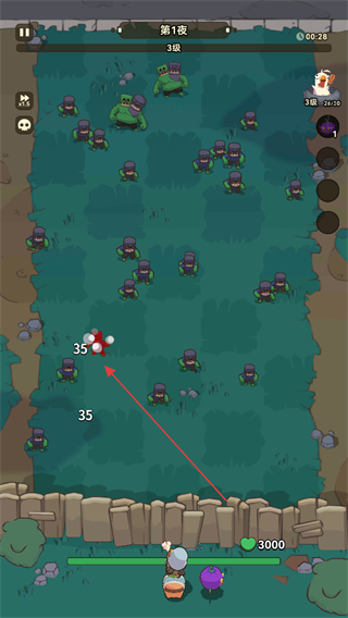 1、在第1夜戰(zhàn)斗中,操控角色攻擊僵尸,造成35點(diǎn)傷害,同時(shí)躲避巨型僵尸的攻擊。