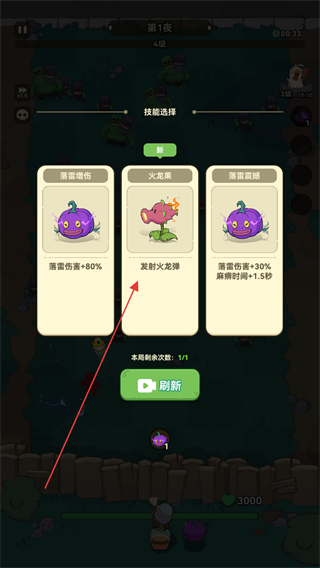 2、升級(jí)時(shí)選擇技能火龍果,發(fā)射火龍彈,增強(qiáng)攻擊能力。