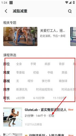 2、在減脂減重頁(yè)面,點(diǎn)擊目標(biāo)課程,進(jìn)入該課程的詳情頁(yè)面。
