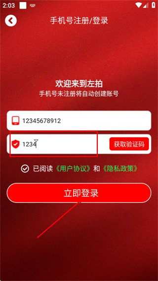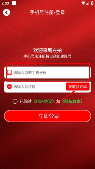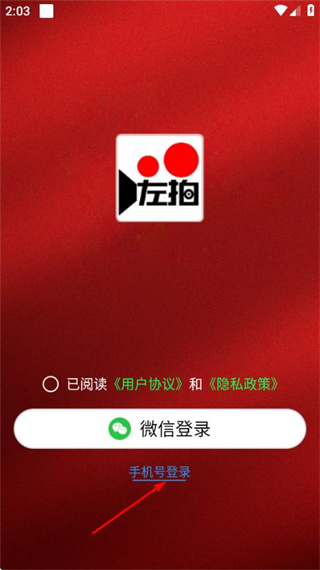 1、在左拍的登錄頁面,點擊手機號登錄選項,進入手機號登錄頁面。