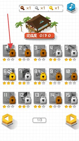 1、進入游戲關卡選擇界面后,通過擁有的鑰匙種類數量解鎖關卡進行挑戰(zhàn)。